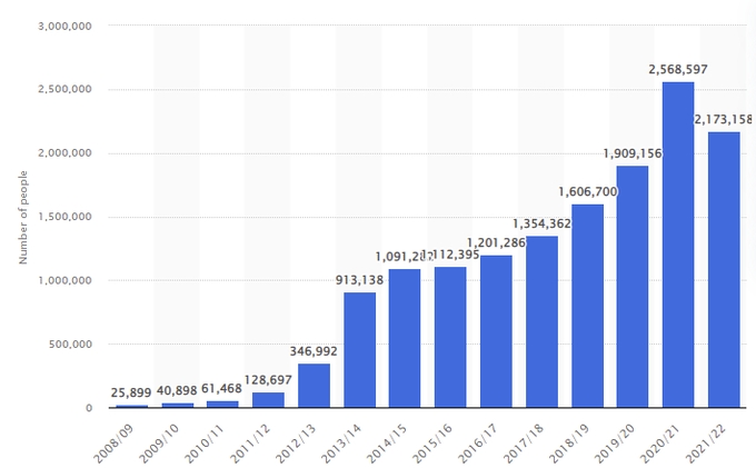 Let’s be clear about where we are.  We live in a society in which mothers are being hospitalised with malnutrition through trying to keep their children fed, and where food bank use has increased 100-fold since the 2008 financial crisis, with the below graph from the Trussell Trust revealing they now cater to 1 in 30 of the UK population.